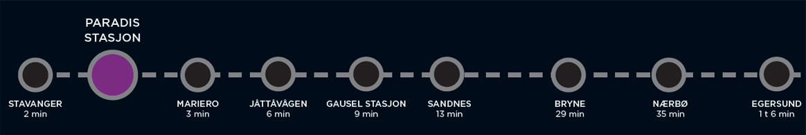 Jærbanen har en frekvens på avgangene med 15 minutters mellomrom i hver retning. Hvor mange kontorbygg i Stavanger-regionen kan skryte på seg å ha en jernbanestasjon som nærmeste nabo? Lagårdsveien er i dag en av de best dekkede traseene for buss. Mange av rutene passerer Lagårdsveien i begge retninger og gir god dekning både vestover og sydover i regionen vår. Stavanger sentrum har et tilbud som få andre byer kan matche. Dette gjelder innenfor kulturliv, matopplevelser, handelsaktivitet, og overnattingsmuligheter. Kontorlokaler på Paradis Stasjon betyr i praksis arbeidsplass i sentrum.